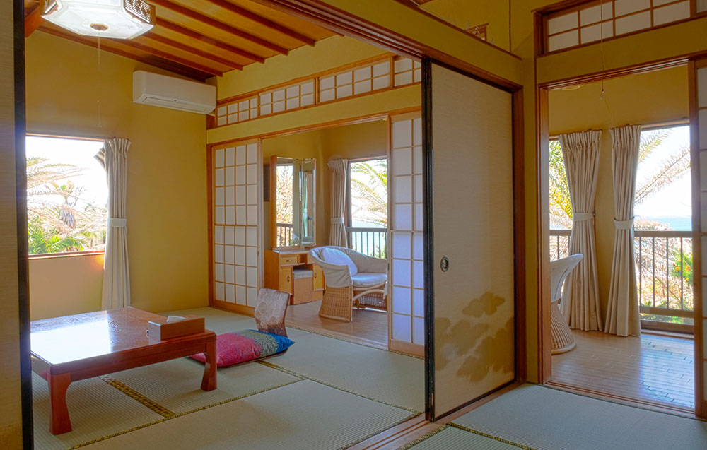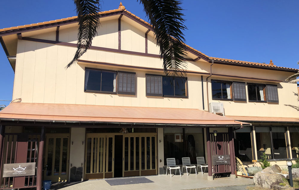 南国風の椰子に囲まれた敷地に、和風の落ち着いた客室を備えた本館は、最大58人宿泊可能な一棟貸しで、団体旅行や合宿、企業研修など幅広いニーズに対応。